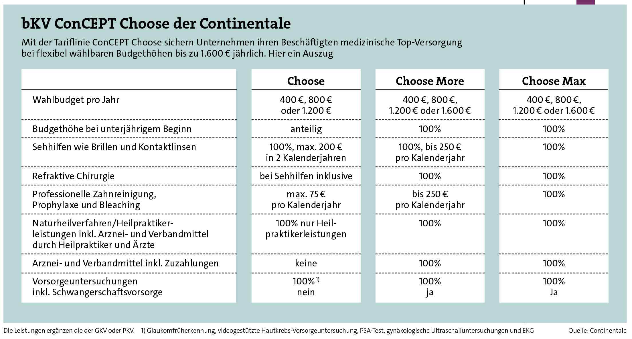 Dennoch scheuen sich viele Maklerinnen und Makler offenbar noch, Firmenkunden auf die betriebliche Krankenversicherung anzusprechen. Besonders erstaunlich ist das, weil bKV-Produkte immer attraktiver werden: Leistungsstark, flexibel und durch digitale Services immer leichter zu betreuen – bestes Beispiel dafür ist das bKV-Angebot ConCEPT der Continentale und hier besonders die Tariflinie ConCEPT Choose mit den Varianten Choose, Choose More und Choose Max, mit denen Firmenkunden das Passende für ihre Belegschaft auswählen können.