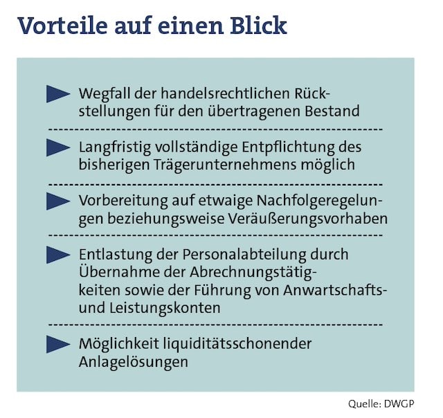 Hinzu kommt: Die steigende Lebenserwartung führt dazu, dass Menschen immer länger Renten beziehen. Der Verantwortungs- und Verwaltungszeitraum von Betrieben verlängert sich dementsprechend ebenfalls. „In dieser Situation sind ganzheitliche Lösungsansätze zur Entlastung und Enthaftung von Pensionsverpflichtungen gefragt“, sagt DWPG-Geschäftsführer Ludger Buschkotte.