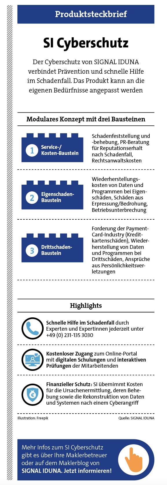 SIGNAL IDUNA bietet ein etabliertes Konzept der Cyberversicherung als verlässliches Sicherheitsnetz an, das sich bei Kunden einfach erklären lässt. Der SI Cyberschutz setzt sich aus drei Bestandteilen zusammen. „Vor dem finanziellen Ausgleich im Schadenfall setzen wir auf Vorsorge mit unserem integrierten Präventionsbaustein. Falls doch etwas passiert, stehen Ihren Kunden unsere Schadenhotline und das gesamte Expertennetzwerk zur Seite“, ergänzt Hanssen. Dazu gehören neben der Krisenkommunikation eine Rechtsberatung und auch forensische Dienstleistungen, etwa die Übernahme der Kosten für die Schadenanalyse.