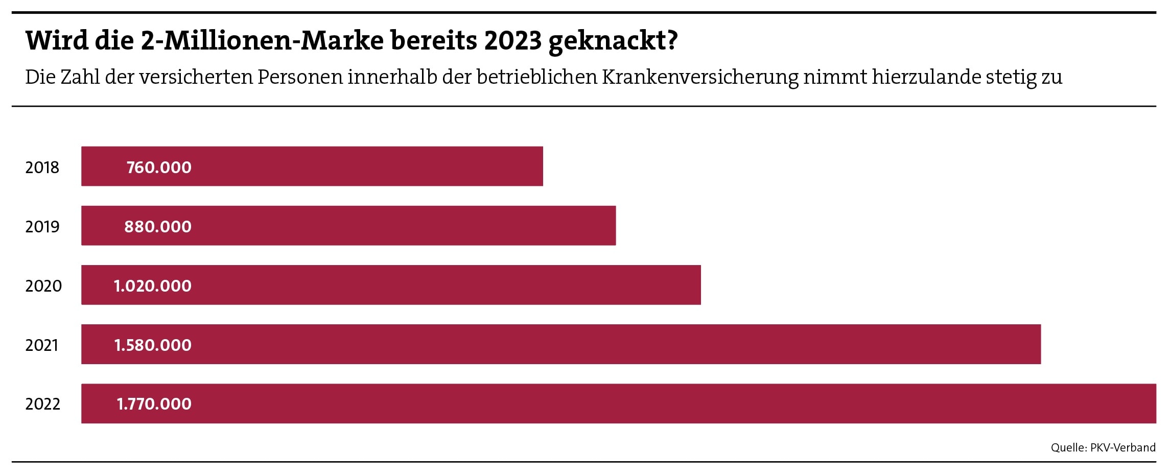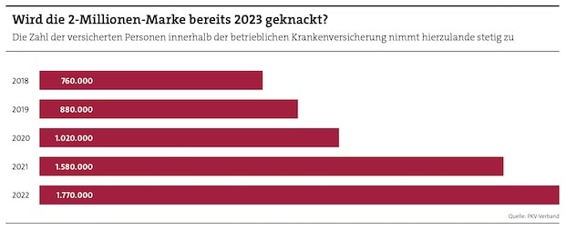 Die betriebliche Krankenversicherung (bKV) wächst und wächst: Ende 2022 boten 22.300 Unternehmen ihren Mitarbeitenden eine Krankenzusatzversicherung an – das ist ein sattes Plus von 22,5 Prozent gegenüber dem Vorjahr, wie der PKV-Verband im Februar meldete. Die Zahl der bKV-Nutznießer stieg im gleichen Zeitraum um 12 Prozent auf 1,8 Millionen (siehe Grafik). Setzt man diese Zuwächse ins Verhältnis, lässt sich ablesen, dass zunehmend auch kleinere Betriebe mit weniger Beschäftigten die bKV nutzen.