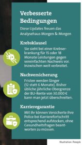 Zudem macht Morgen & Morgen einen interessanten, wenn auch nicht ganz neuen, Trend bei den Zielgruppen aus. Denn die Versicherungen bieten zunehmend Leistungen für Schüler, Auszubildende und Berufsein­steiger an. So setzt beispielsweise die Helvetia bei ihrer Schüler-BU auf einen fondsgebundenen Ansatz. Der Renditemotor etwa über ETFs kann dann die Beiträge senken helfen. Das geht aber mit dem Mindestanspruch einher, dass sich diese Kunden flexibel nachversichern und ihren Schutz erhöhen können. Schließlich verändert sich in jungen Jahren beruflich noch eine ganze Menge.