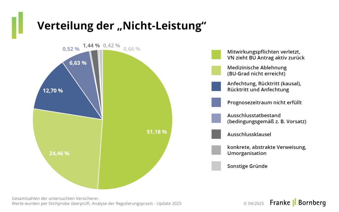 Damit wird klar, dass die sogenannte Verweisung eine eher kleine Rolle spielt. „Als Ablehnungsgrund sind Verweisungen nur in homöopathischen Dosen nachweisbar“, sagt Michael Franke, geschäftsführender Gesellschafter von Franke und Bornberg. Mit einer Quote von 0,12 Prozent beziehungsweise sieben Leistungsfällen aus dem Altbestand eigne sich der Verzicht auf abstrakte Verweisung als Differenzierungsmerkmal längst nicht mehr. Ähnlich selten kam es auch vor, dass der Versicherer forderte, der Kunde möge sein Unternehmen umorganisieren. Das waren 0,16 Prozent der abgelehnten Fälle.