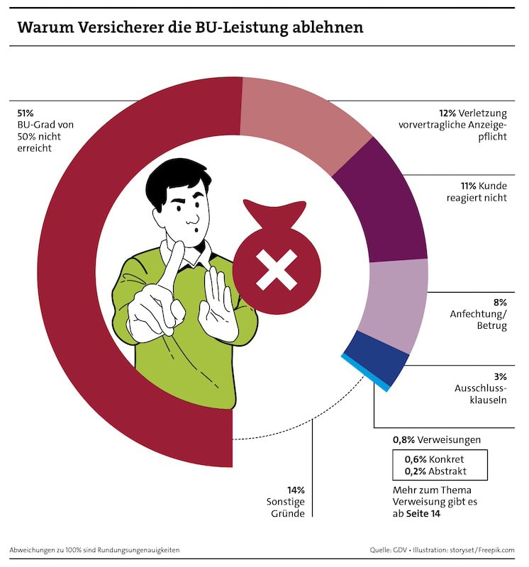 Manche BU-Kunden stellen deshalb erst gar keinen Antrag auf Berufsunfähigkeitsrente. Andere geben im Verlauf der Leistungsprüfung auf und reagieren nicht mehr auf Nachfragen des Versicherers zum genauen Sachverhalt oder bleiben angeforderte Unterlagen schuldig. Laut Gesamtverband der Deutschen Versicherungswirtschaft (GDV) brechen 11 Prozent der BU-Antragsteller das manchmal zermürbende Ping-Pong-Spiel mit dem Versicherer ab – und verzichten damit auf eine mögliche Berufsunfähigkeitsrente.
