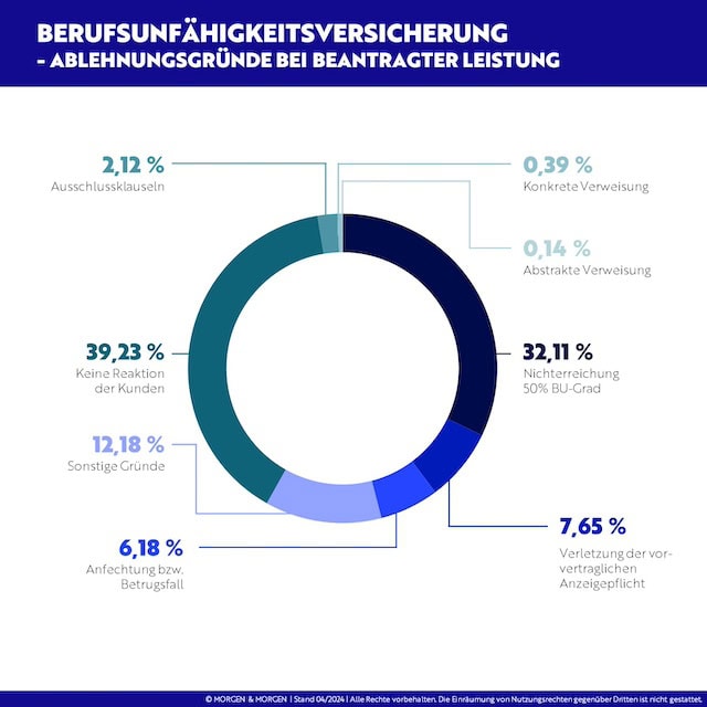 Auch bei den Gründen, aus denen Versicherer einen Antrag auf  BU-Leistung ablehnen, hat sich nicht viel geändert.  Der Abbruch in der Kommunikation durch den Versicherungsnehmer steht mit knapp 40 Prozent weiterhin an der Spitze und ist sogar gegenüber dem Vorjahr noch leicht gestiegen. Das Nichterreichen eines BU-Grades von 50 Prozent ist mit rund 32 Prozent der zweithäufigste Grund.