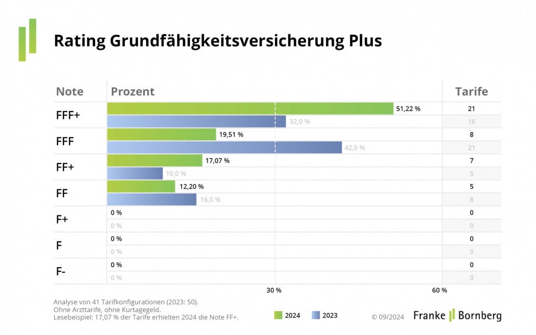 Das Bild bei der Grundfähigkeitsversicherung Plus: 18 Anbieter mit 41 Haupttarifen und 1.413 Kombinationen nach 75 Kriterien bewertet. Sogar mehr als jeder zweite Tarif (51,2 Prozent) erreichte das FFF+.
