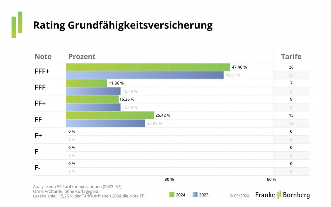 Abgesehen von den eingangs erwähnten Schwierigkeiten können sich die Ergebnisse sehen lassen. In der normalen Grundfähigkeitsversicherung traten 25 Anbieter mit 63 Haupttarifen und 4.038 Kombinationen an den Start. Die Analyse berücksichtigt 67 Kriterien. In die Wertung gelangten 59 Tarife, und tatsächlich erreicht fast jeder zweite von ihnen die Spitzennote FFF+.