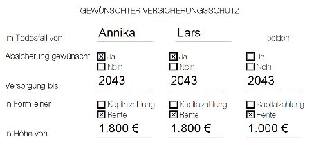 Zuletzt ermitteln wir noch das subjektive Bedürfnis zur Absicherung der Kunden. Hierfür nutzen wir den Fragebogen Todesfall. Das ist eine einfache Übersicht im PDF-Format. Wir tragen die Versorgungslücke aus der Haushaltsübersicht im Todesfall ein. Wenn ein positives Vermögen vorliegt, tragen wir dieses ebenfalls ein. Anhand dieser beiden Zahlen können wir errechnen, wie lange der oder die Hinterbliebene vom Vermögen zehren kann. Das geht ganz einfach zum Beispiel auf zinsen-berechnen.de. Wir nehmen als Annahme immer ein Prozent Verzinsung und 2 Prozent Dynamisierung zum Inflationsausgleich. Steuern berücksichtigen wir keine.