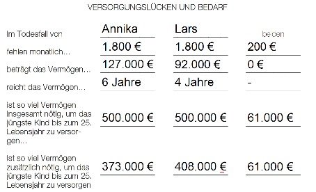 Im letzten Schritt ermitteln Sie noch den Bedarf an zusätzlichem Vermögen, um die Versorgung des jüngsten Kindes zu sichern. Ziehen Sie einfach das bestehende Vermögen vom Soll-Vermögen ab. In unserem Beispiel fehlen also noch 140.000€.