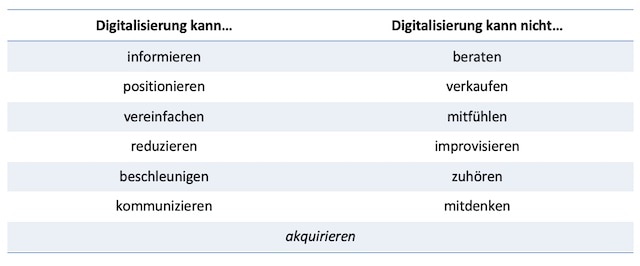 Was auffällt: In allen Bereichen, die mit der eigentlichen Beratungsleistung zu tun haben, hilft uns die Digitalisierung nicht wirklich weiter. Sie können informieren (Blog). Über eine gute Homepage und Social Media können Sie sich als Experte für XYZ positionieren. Sie macht vieles einfacher und schneller (Vergleichsrechner). Sie kommunizieren mit digitalen Tools (E-Mail, Video, Messenger). Aber bei allem, was Vertrauen schafft und Sie als Mensch und Berater auszeichnet, Sie also von der grauen Masse abhebt, benötigen Sie die Digitalisierung schlicht nicht.