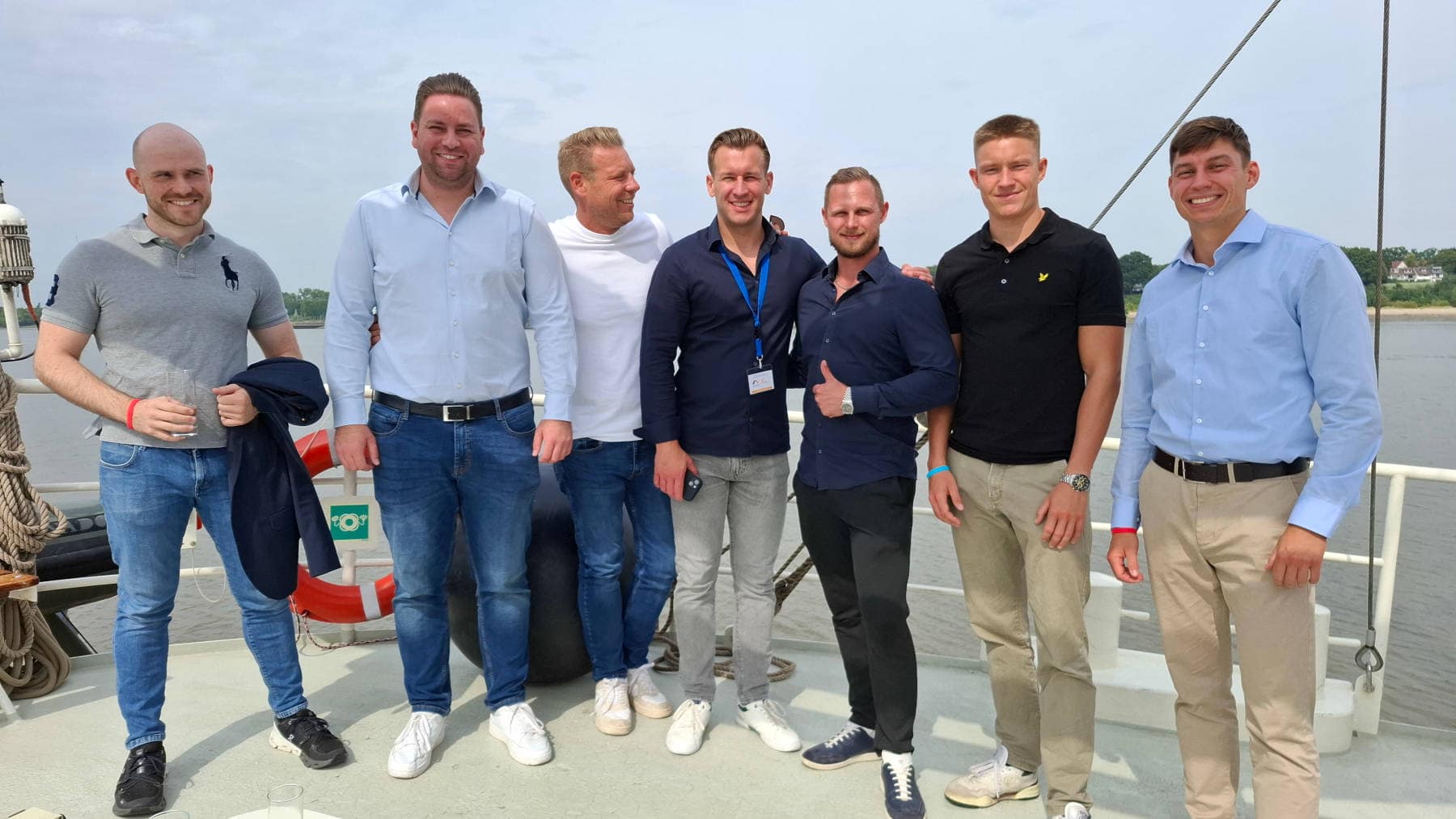 In der Zwischenzeit ist es Zeit für ein Gruppenfoto mit der Zukunft der Branche. Denn Charta hat ein Ausbildungsprogramm für Jungmakler mit dem Namen „Building Business“ auf die Beine gestellt. Es soll jungen Menschen dabei helfen, im Maklereibetrieb die unternehmerischen Anforderungen hinzubekommen. Das Programm startete 2024, und auf dem Segelschiff sind sechs Teilnehmer vertreten. Hier sind sie:
