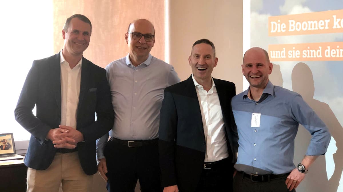 Gruppenfoto in den Räumen der Ideal: Vorstandschef Maximilian Beck (2. v. r.) mit Jan Roß (links), Matthias Heß (2. v. l.) und Andreas Harms von Pfefferminzia (Foto: Pfefferminzia)