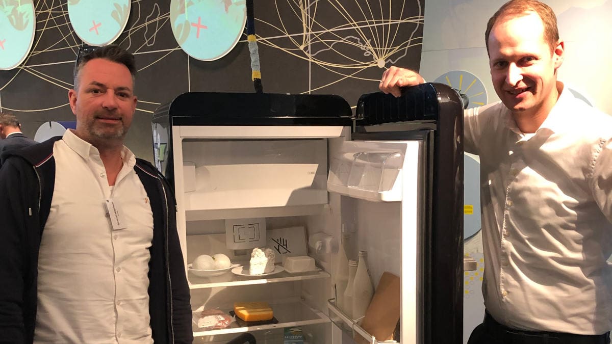 Ein Kühlschrank für die Zukunft? Emanuel Weyfeuer (links) und Sebastian Empting von der Zurich prüfen das mal nach (Foto: Pfefferminzia)