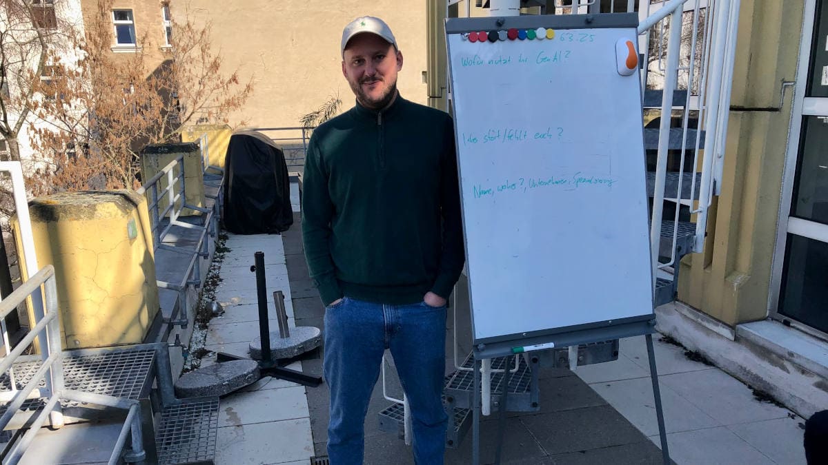 Muffintech-Chef und -Gründer Simon Moser schreibt auf einer Tafel mit, welche Erfahrungen seine Gäste mit künstlicher Intelligenz haben, und was ihnen noch fehlt (Foto: Pfefferminzia)