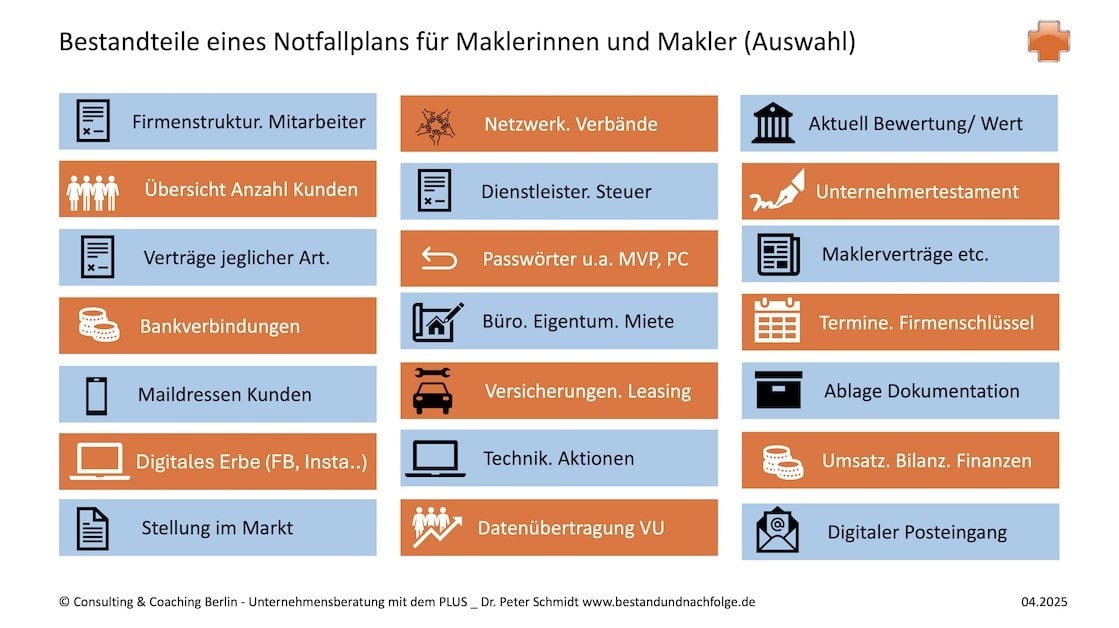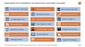 Besonders bei Einzelunternehmerinnen und -unternehmern muss der erste Schritt einer Nachfolgeplanung ein Notfallplan sein. Dabei kommt es nicht darauf an, ob die Maklerin 40 Jahre oder der Makler 60 Jahre alt ist. Notfälle können in jeder Altersgruppe durch Unfall, Krankheit oder Schlimmeres eintreten. Deshalb „dränge“ ich in meinen Strategie- und Nachfolgeberatungen immer auch bei meinen Mandaten darauf, dass dieses Thema zuerst angegangen wird.
