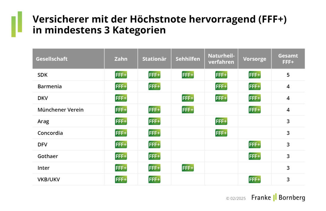 Versicherer mit Höchstnoten in der Krankenzusatzversicherung 2025 (Quelle: Franke und Bornberg)