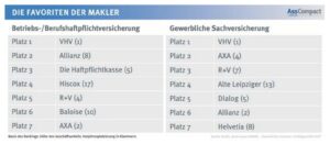 In der gewerblichen Sachversicherung zeigt sich ein ähnliches Bild. Die VHV schafft Platz 1, auf den weiteren Rängen liegen Axa und R+V. Beide haben sich verbessert, die Axa lag im Vorjahr auf Platz 4 und die R+V auf Platz 7.