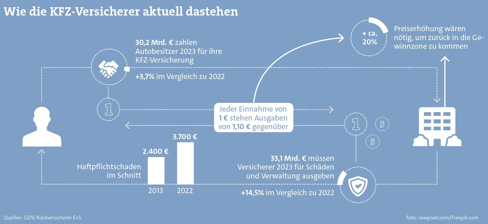 Dass sich die Prämien für die KFZ-Versicherung auch in Zukunft „kaum erhöhen“ werden, ist nicht sehr wahrscheinlich. „Preiserhöhungen von 20 Prozent wären nötig, um eine Rückkehr zur Profitabilität zu gewährleisten“, sagte Michael Pickel, Chef des zur Hannover Rück gehörenden Rückversicherers E+S, gegenüber der „Süddeutschen Zeitung“ auf dem Treffen der Rückversicherer in Monte Carlo. Weil der Wettbewerbsdruck in der Sparte aber so hoch ist, werden die Versicherer die Beiträge aller Voraussicht nach nur in behutsamen Schritten anheben.