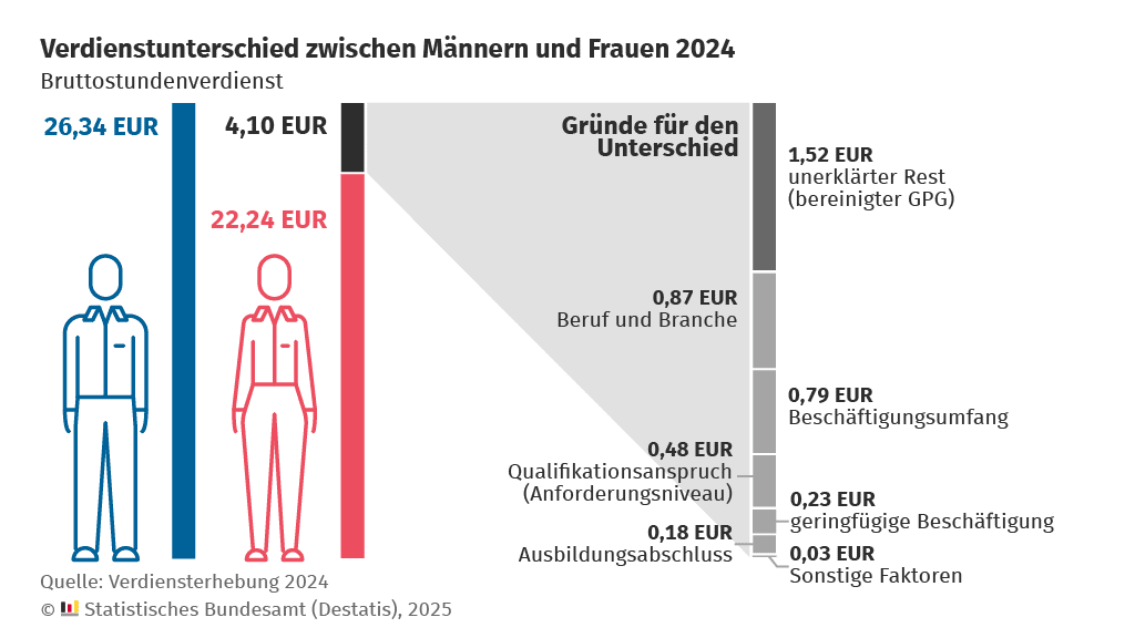 Der sogenannte Gender Pay Gap, also die Lücke zwischen den Verdiensten von Frau und Mann in Deutschland, ist weiter zurückgegangen. Wie das Statistische Bundesamt (Destatis) berichtet, erhielten Frauen im Jahr 2024 brutto im Durchschnitt 22,24 Euro pro Stunde. Männer bekamen 26,34 Euro – ein Aufschlag von 4,10 Euro.
