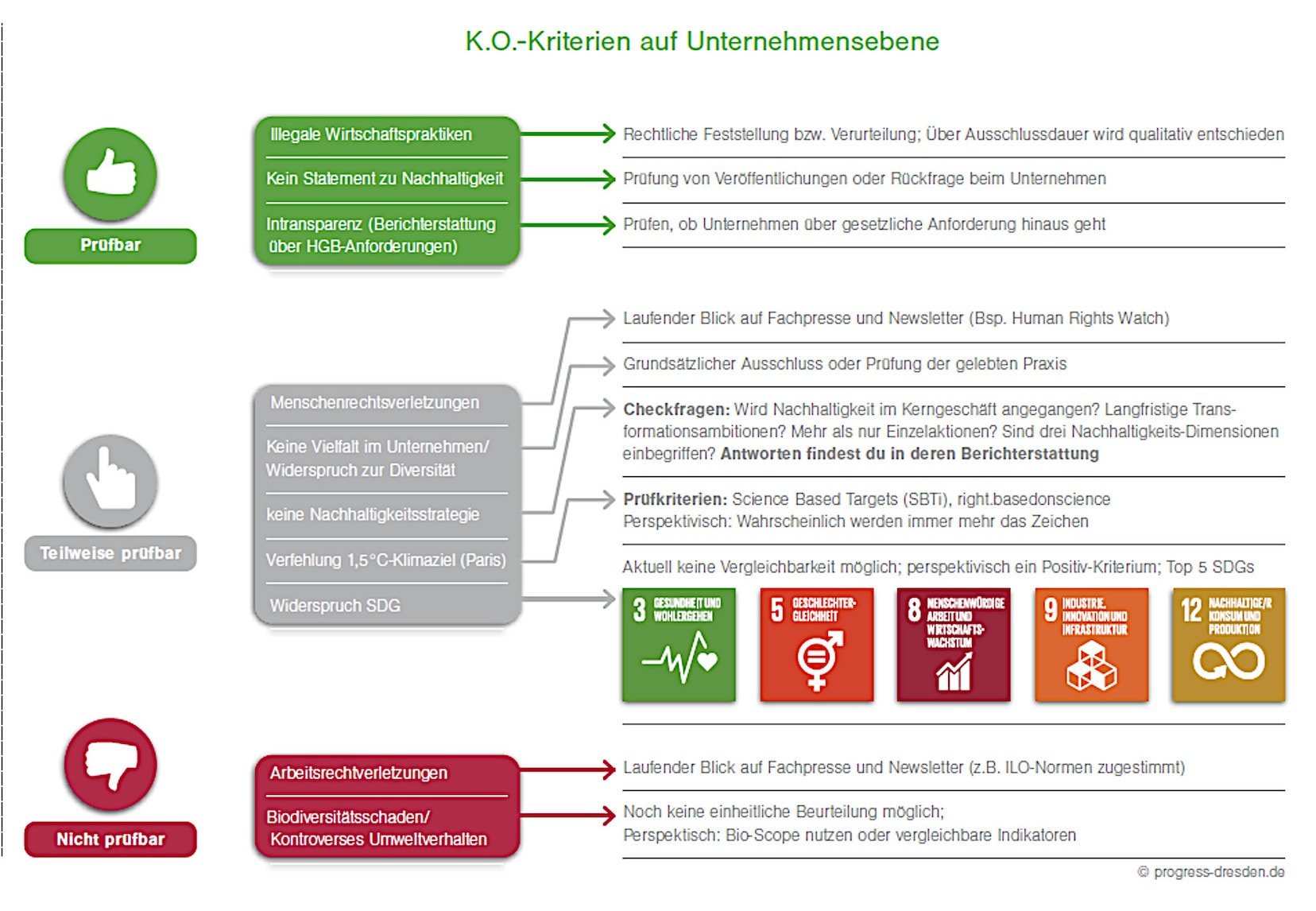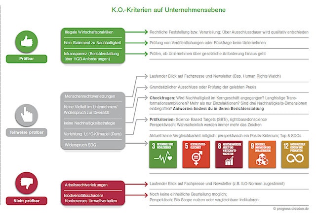 Leider kann man Stand heute noch nicht exakt sagen, was ein nachhaltiger Versicherer ist. Das gehört zur Wahrheit (im Beratungsgespräch) dazu. Umgekehrt können wir jedoch sagen, was nicht nachhaltig ist. Solche Unternehmen kann man zukünftig in der Auswahl ausklammern. Dazu gibt es verschiedene prüfbare, eingeschränkt prüfbare und bislang nicht prüfbare K.O.-Kriterien entwickeln. Das sind: