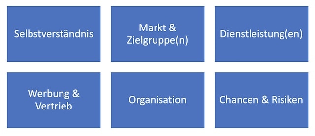 Die Nachhaltigkeitsstrategie sollte sich in Ihre Gesamtstrategie einfügen. Als Gesamtstrategie begreifen wir das Geschäftsmodell. Vorab sollte also Ihr Geschäftsmodell klar sein. Sofern das noch nicht der Fall ist, hier die Kurzübersicht, welche Themen zum Geschäftsmodell gehören: