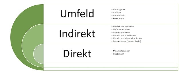 Die Stakeholder-Analyse sollte der Ausgangspunkt ihrer Nachhaltigkeitsbemühungen sein. Eine Möglichkeit, relevante Stakeholder zu identifizieren, ist die Stakeholder-Map. Sie unterscheidet die Stakeholder nach direkten und indirekten Stakeholdern sowie dem Umfeld. Für ein Maklerunternehmen könnte das beispielsweise so aussehen: