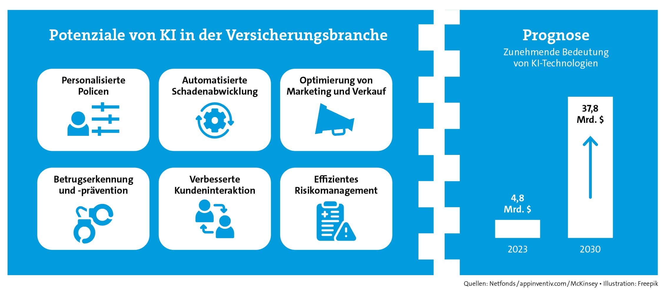 Bei der Netfonds Gruppe verweist man auf sechs Felder, in denen die Nutzung von KI großes Potenzial aufweist (siehe Grafik unten). „KI ist ein Thema, das alle Bereiche eines Unternehmens betrifft. Es geht nicht nur um die Implementierung neuer Technologien, sondern auch um die Anpassung von Geschäftsmodellen, Prozessen und der Unternehmenskultur. Unternehmen, die KI erfolgreich nutzen wollen, müssen alle Ebenen des Unternehmens miteinbeziehen“, sagt Dietgar Völzke, Technikchef der Netfonds Gruppe.