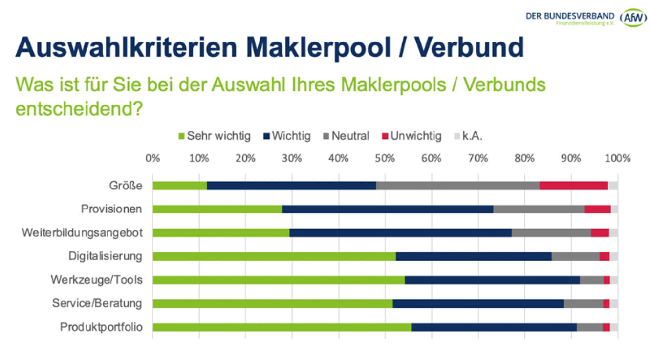 Der Branchenverband AfW wollte von seinen Mitgliedern wissen, wonach sie gehen, wenn sie sich einem Maklerpool oder Maklerverbund anschließen. Die Größe kommt bei den Antworten ganz zum Schluss. Viel wichtiger sind ganz andere Eigenschaften.