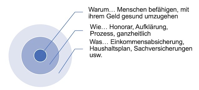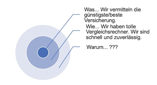 Der „Golden Circle“ ist ein spannender Kommunikationsansatz von Unternehmensberater Simon Sinek. Der hatte festgestellt, dass erfolgreiche Unternehmen anders kommunizieren als weniger erfolgreiche. Die Erfolgreichen stellen das „Warum“ an den Anfang ihrer Kommunikation. Erst anschließend erläutern sie das „Wie“, um zum Schluss das „Was“ zu erklären. So sieht das allgemein aus: