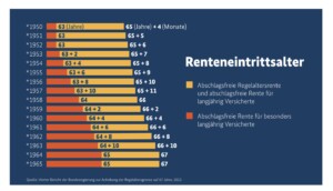 Als „Rente mit 63“ wird fälschlicherweise oftmals die Altersrente für besonders langjährig Versicherte“ bezeichnet. Damit ist der Renteneintritt ohne Abschläge nach 45 Versicherungsjahren gemeint. Diese aber kann nicht mehr mit 63 Jahren in Anspruch genommen werden, da die Regelaltersgrenze schrittweise ansteigt. Sie ist daher aktuell – für den Geburtsjahrgang 1961 – eine abschlagsfreie Rente mit 64 Jahren und sechs Monaten (siehe Grafik).