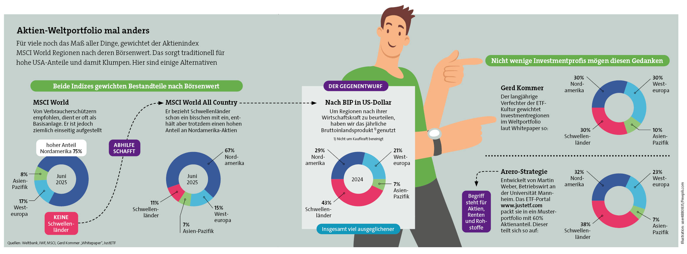 Großinvestoren arbeiten übrigens ähnlich. Die Vorstandschefin des Fonds zur Finanzierung der kerntechnischen Entsorgung (Kenfo), Anja Mikus, teilt das Milliardenvermögen nach BIP und nicht nach Börsenwert auf. Je 40 Prozent liegen in den USA und Europa und 20 Prozent in der Pazifik-Region. Und auch Ali Masarwah hält die Wirtschaft für einen guten Maßstab, den man dann nach persönlichem Geschmack variieren könne. Zum Beispiel, indem man über einen „Kommunismus-Malus“ China etwas geringer gewichtet.