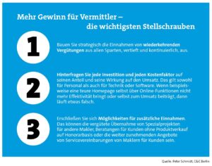 Die Gründe für einen zu geringen Gewinn von Vermittlern sind demnach extrem vielfältig und längst nicht nur im vermeintlich zu hoch festgesetzten Unternehmerlohn zu finden. Die Frage ist: Wie können Vermittelnde, die ihr Problem erkannt haben, darauf reagieren? Welche Stellschrauben führen am erfolgversprechendsten zu nachhaltig mehr Ertrag?