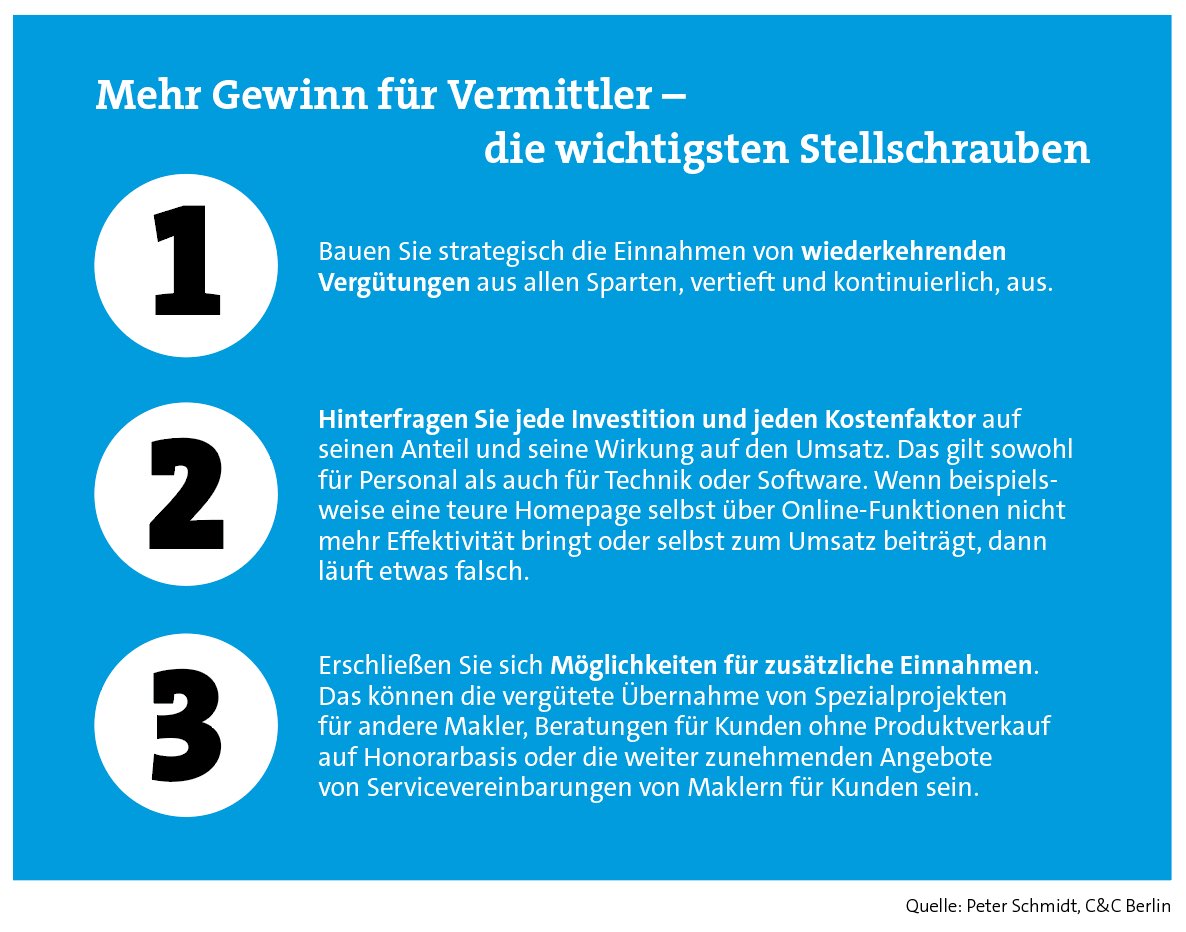 Unternehmensberater Schmidt nennt hier drei zentrale Ansätze (Kasten unten), die auch viele Experten erwähnen: mehr laufende Vergütungen, Kosten hinterfragen und Servicevereinbarungen. So empfiehlt auch Netfonds seinen Partnern, die Abhängigkeit von Abschlussprovisionen durch die Umstellung auf ratierliche beziehungsweise laufende Vergütungen zu reduzieren. Denn das erhöht die Planbarkeit von Einkommen und Gewinn. „Insbesondere Einzelvermittler und kleine Vertriebseinheiten können sich besser auf laufende und ratierliche Provisionseinnahmen einstellen als große Unternehmen. Auch Stornierungen von Verträgen hätten auf Vermittlerseite keine oder lediglich geringe Auswirkungen“, so NVS-Vorstand Horn.
