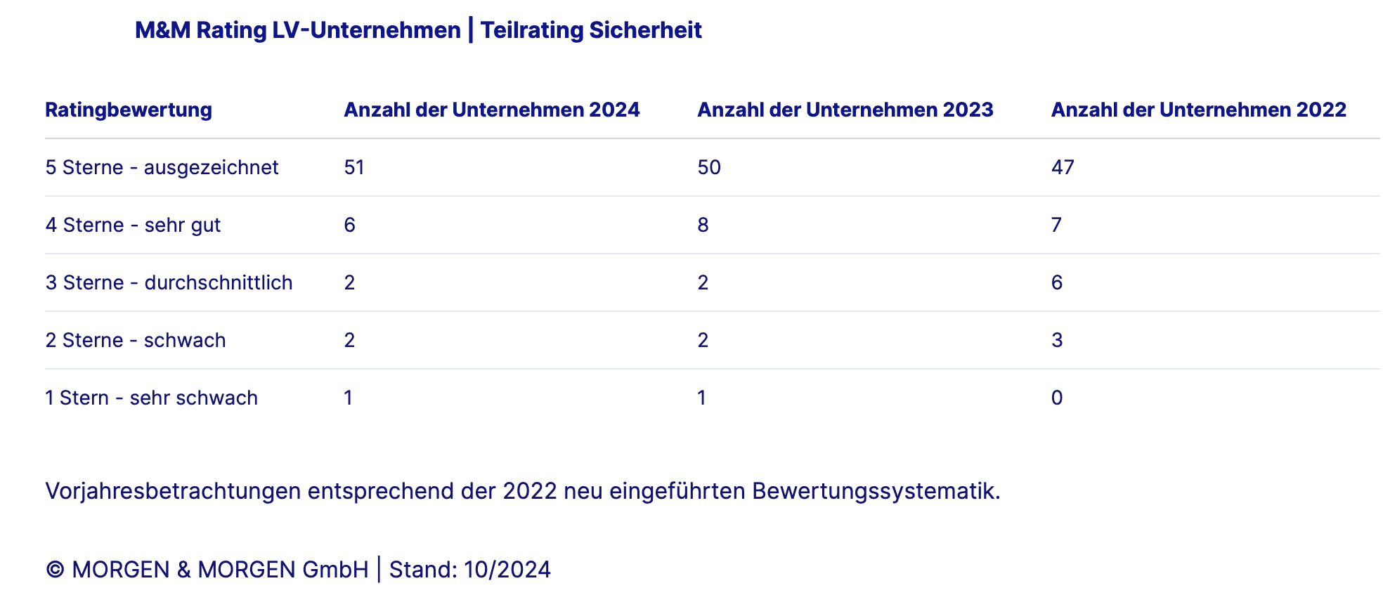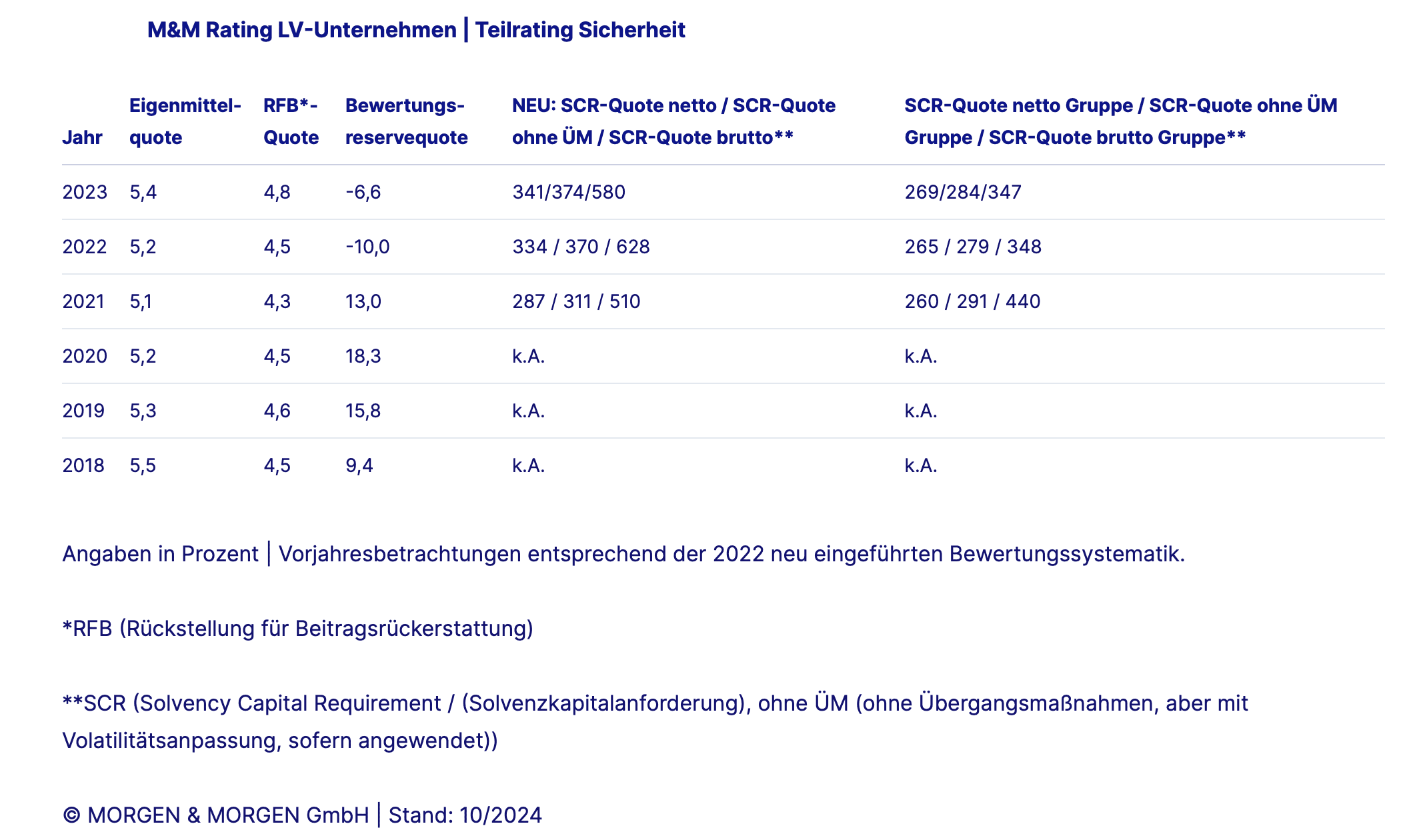 Das Teilrating Sicherheit bewertet die finanzielle Stabilität und das Eigenkapital der Lebensversicherer, falls es zu einer Krise kommt. Neben den Eigenmitteln haben die Analysten die Bedeckungsquoten nach Solvency II betrachtet.