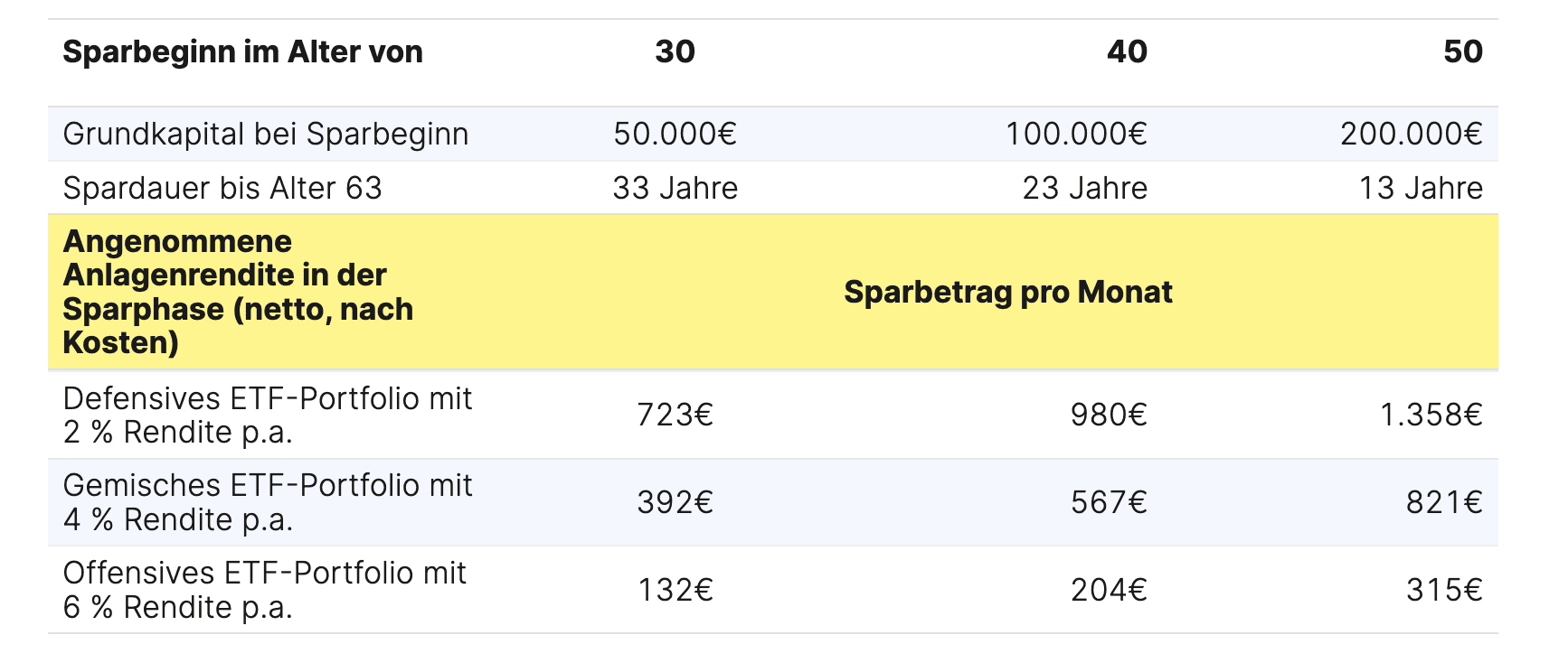 Ein Best Ager biegt auf die Zielgerade zur Frührente ein. Er kann zwar nur noch 13 Jahre sparen, hat aber eine gute Ausgangslage: Sein Gehalt ist spitze, das Eigenheim ist abgezahlt und er verfügt über eine Erbschaft von 200.000 Euro. Eine Sparrate von 1.358 Euro pro Monat – bei 2 Prozent Rendite – ist ihm zu hoch, die offensive Anlage zu 6 Prozent zu riskant. Er entscheidet sich für das Mischportfolio, die Sparrate von 821 Euro ist gut machbar.