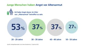 Altersarmut ist ein Risiko, dass insbesondere viele junge Menschen für sich sehen. 53 Prozent der Personen zwischen 20 und 29 Jahren haben Angst davor, im Alter nicht genug Geld zu haben (Vorjahr: 46 Prozent). Das sind knapp doppelt so viele wie bei den Menschen, die über 50 Jahre alt sind (27 Prozent).