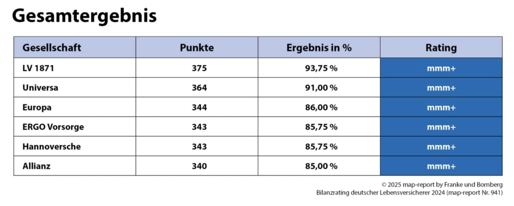 Sechs Lebensversicherer schafften im Bilanzrating diese Bestnote. Nummer 1 ist die LV1871 mit 375 Punkten beziehungsweise 93,75 Prozent. Auf der zweiten Position folgt die Universa mit 364 Punkten (91,00 Prozent) und auf Platz 3 folgt die Europa mit 344 Punkten (86,00 Prozent).