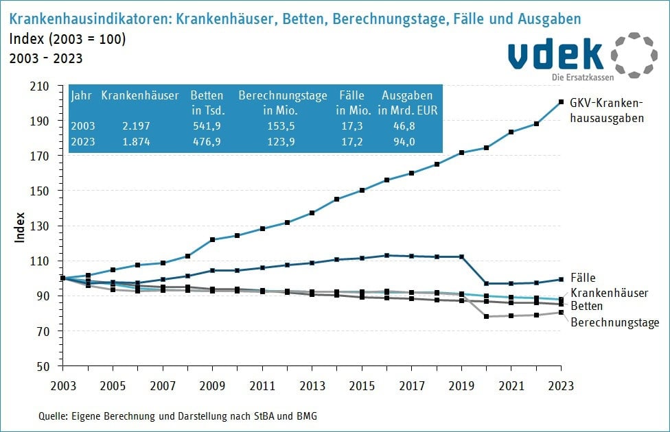 Ausgaben für Krankenhausbehandlung, Krankenhäuser, Betten, Berechnungstage und Fälle (Quelle: VDEK)