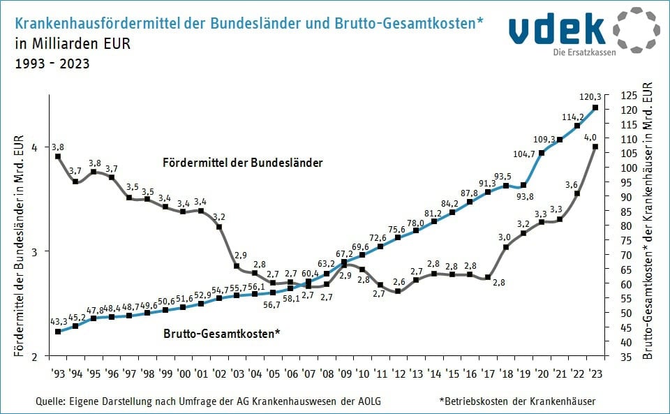 Krankenhausfördermittel und Brutto-Gesamtkosten im Krankenhauswesen (Quelle: VDEK)