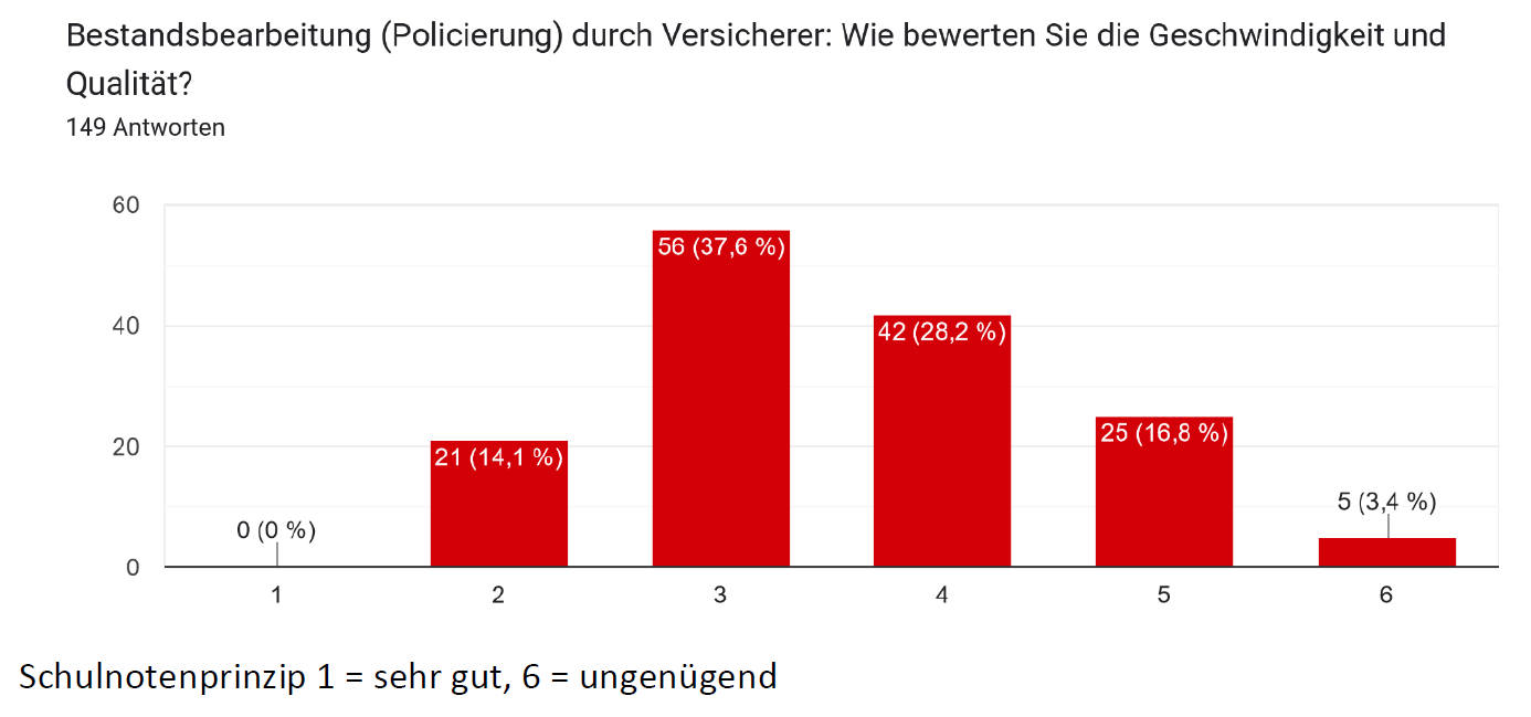 Etwas besser sieht es bei der Frage aus, wie gut die Versicherer die Bestände bearbeiten, sprich: der Policierung. Hier vergaben immerhin zwei Drittel die Noten 3 oder 4. Eine 6 erteilten lediglich fünf Makler. Doch der Trend ist wohl eher unerfreulich. So heißt es vom BDVM, dass die Makler in Kommentaren auf „immer weniger Kompetenz bei den Versicherern“ hinwiesen. Den gesamten Notenspiegel zeigt die Grafik.