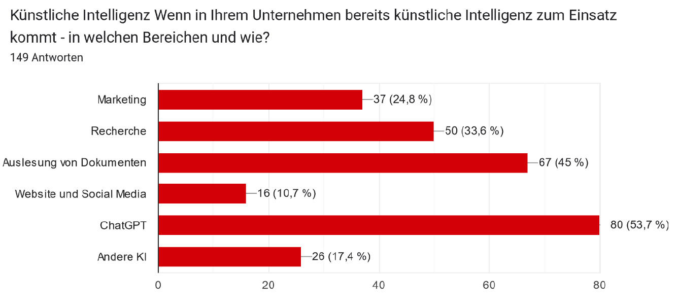 Als mögliche Hilfe in der Personalnot gilt nach wie vor Technik allgemein und Künstliche Intelligenz (KI) im Speziellen. Entsprechend aufgeschlossen zeigen sich die Befragten bei einer entsprechenden Frage. Die folgende Grafik zeigt, auf welchen Gebieten sie KI bereits nutzen.
