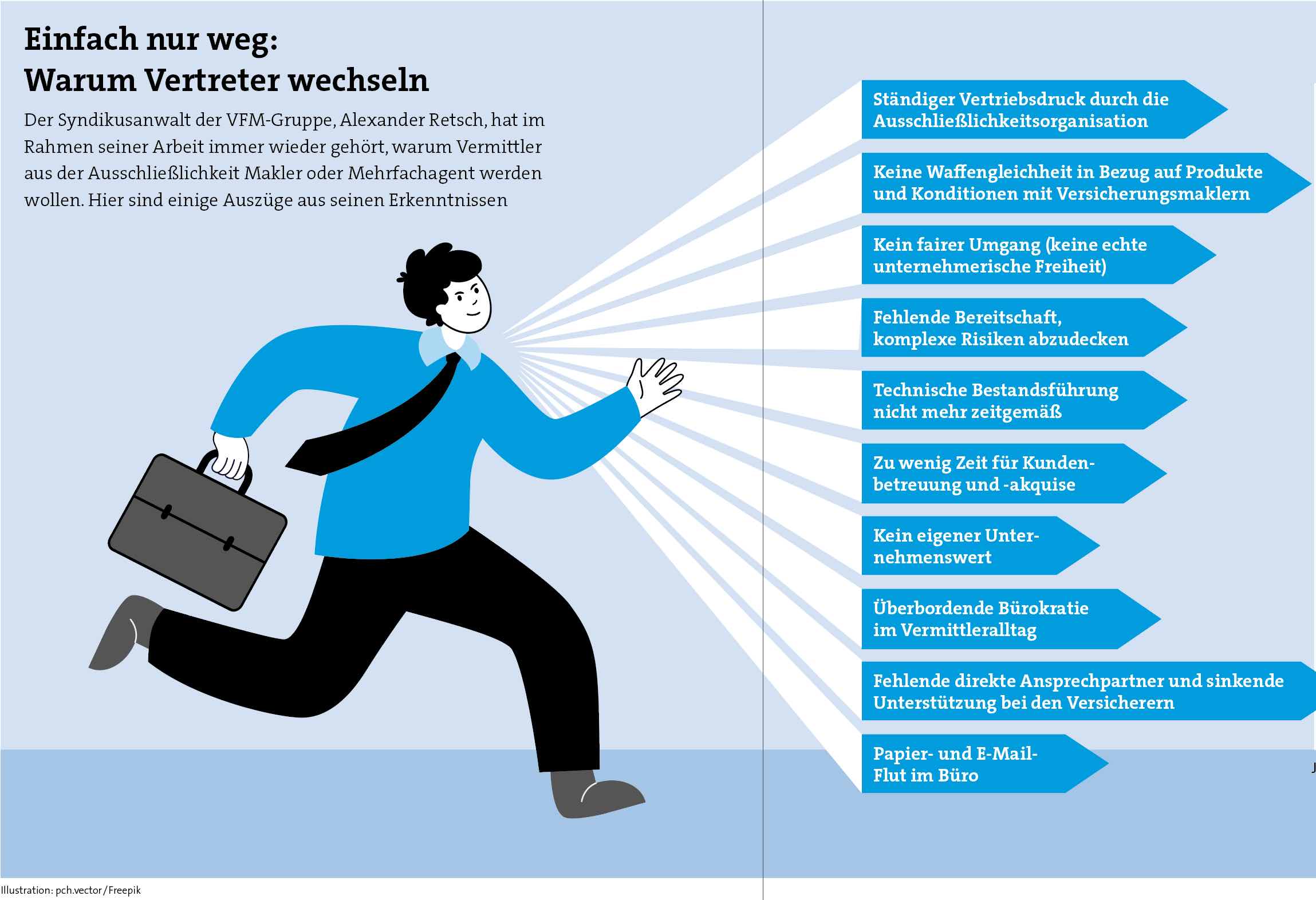 Außerdem zählt Retsch einige immer wieder genannte Wechselgründe auf (siehe Grafik). Ganz oben auf der Liste steht: „Ständiger Vertriebsdruck – oft auch gegen die Kundeninteressen“. Andere beklagten, dass man keine Waffengleichheit mit Maklern hatte, was Produkte und Rabatte betrifft. So erklärt sich auch Alexandra Maidls Freude: „Wir können endlich alle Produkte anbieten, die am Markt verfügbar sind.“