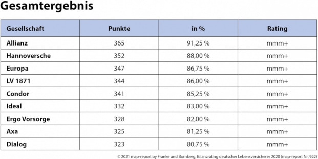 Die beste Bewertung im Rating bekam die Allianz, die mit 365 von maximal 400 Punkten (91,25 Prozent) ein „mmm+“ für exzellente Leistungen erzielte. Neben der Allianz finden sich in der Spitzengruppe außerdem die Hannoversche, Europa, LV 1871, Condor, Ideal, Ergo Vorsorge, Axa sowie Dialog wieder (siehe Tabelle). Die Swiss Life verfehlte mit 318 Punkten die höchste Bewertung, für die 320 Punkte nötig waren, nur knapp.
