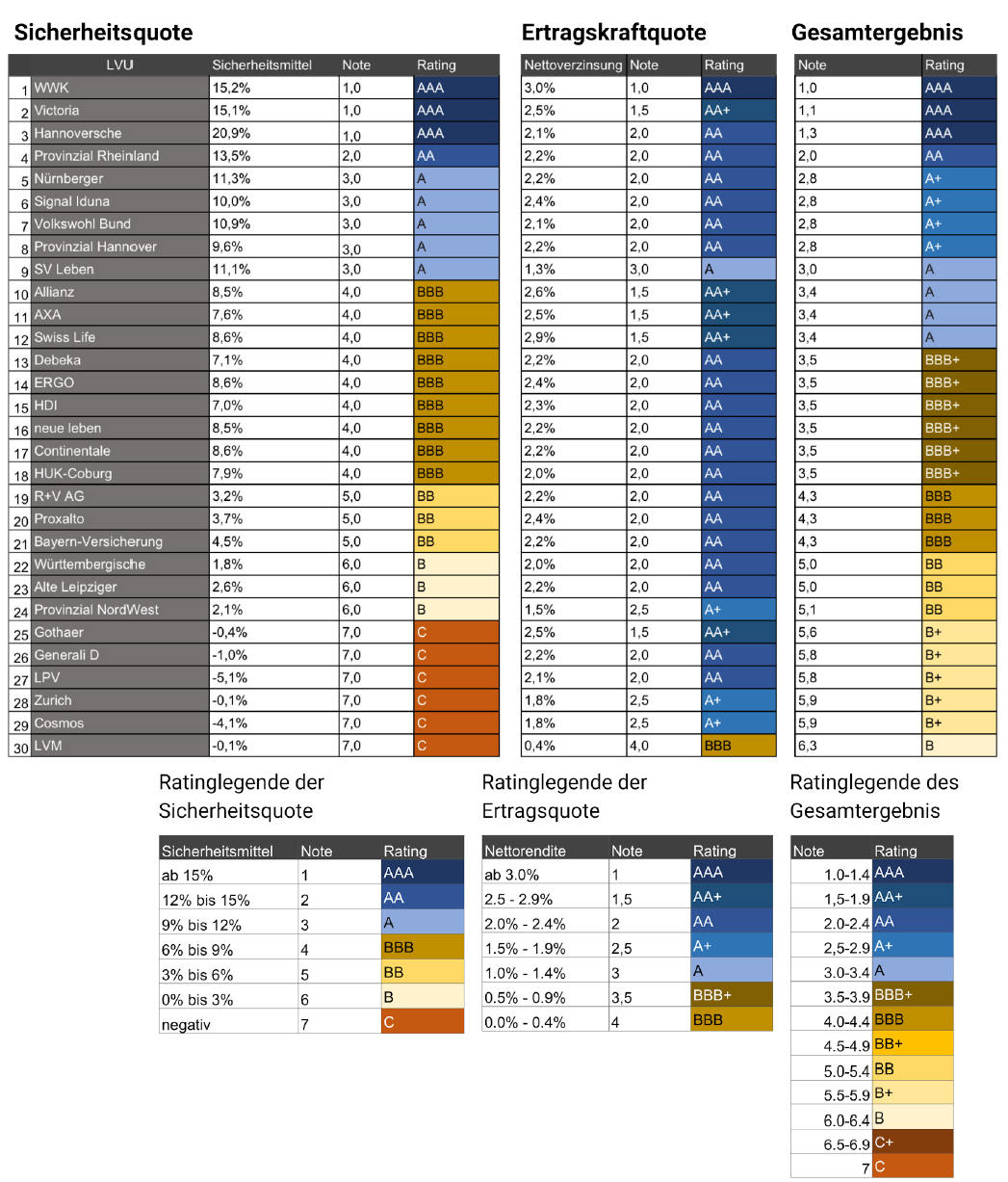 Folgende Lebensversicherer erreichten Ratings von AAA bis A (Note in Klammern):