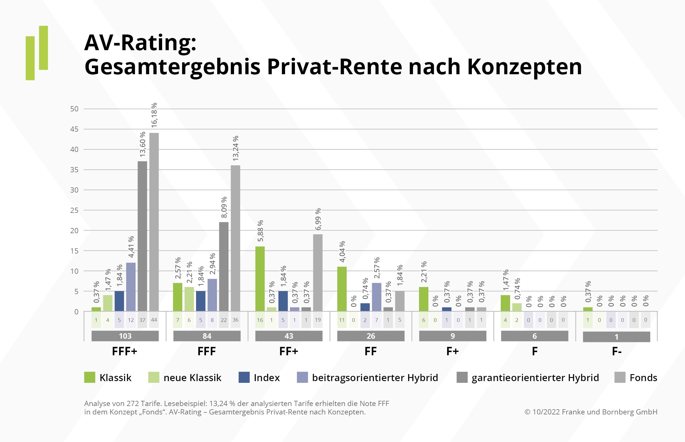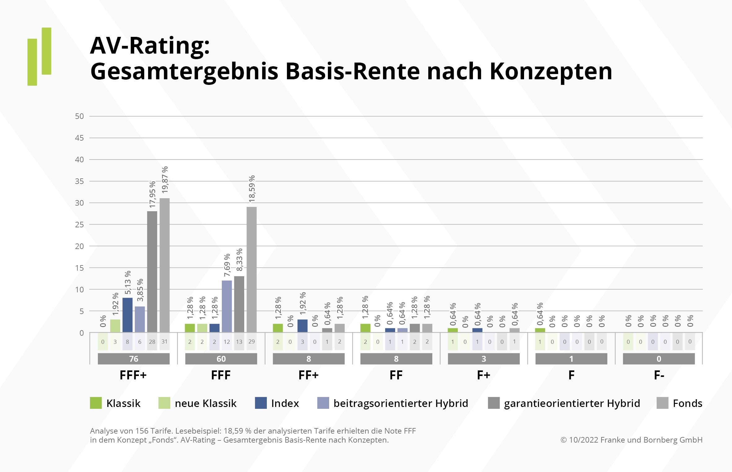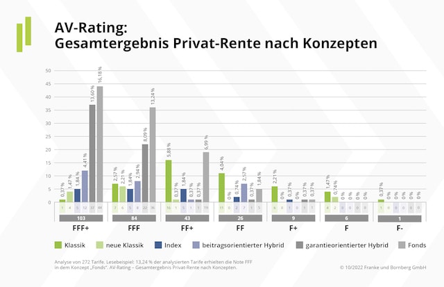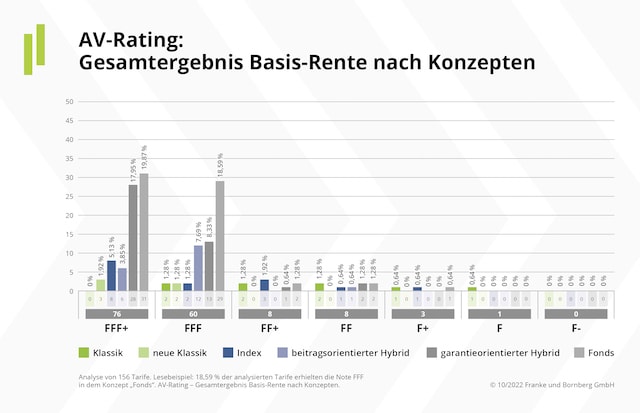 Knapp die Hälfte der 156 untersuchten Rürup-Tarife erreichen die höchste Bewertungsklasse FFF+ (hervorragend). Fonds-Tarife (65) und garantieorientierte Hybrid-Tarife (44) machten die Mehrzahl des Angebotes aus. Klassik (8) und Neue Klassik (5) seien nur noch in homöopathischen Mengen vertreten, so die Analysten.