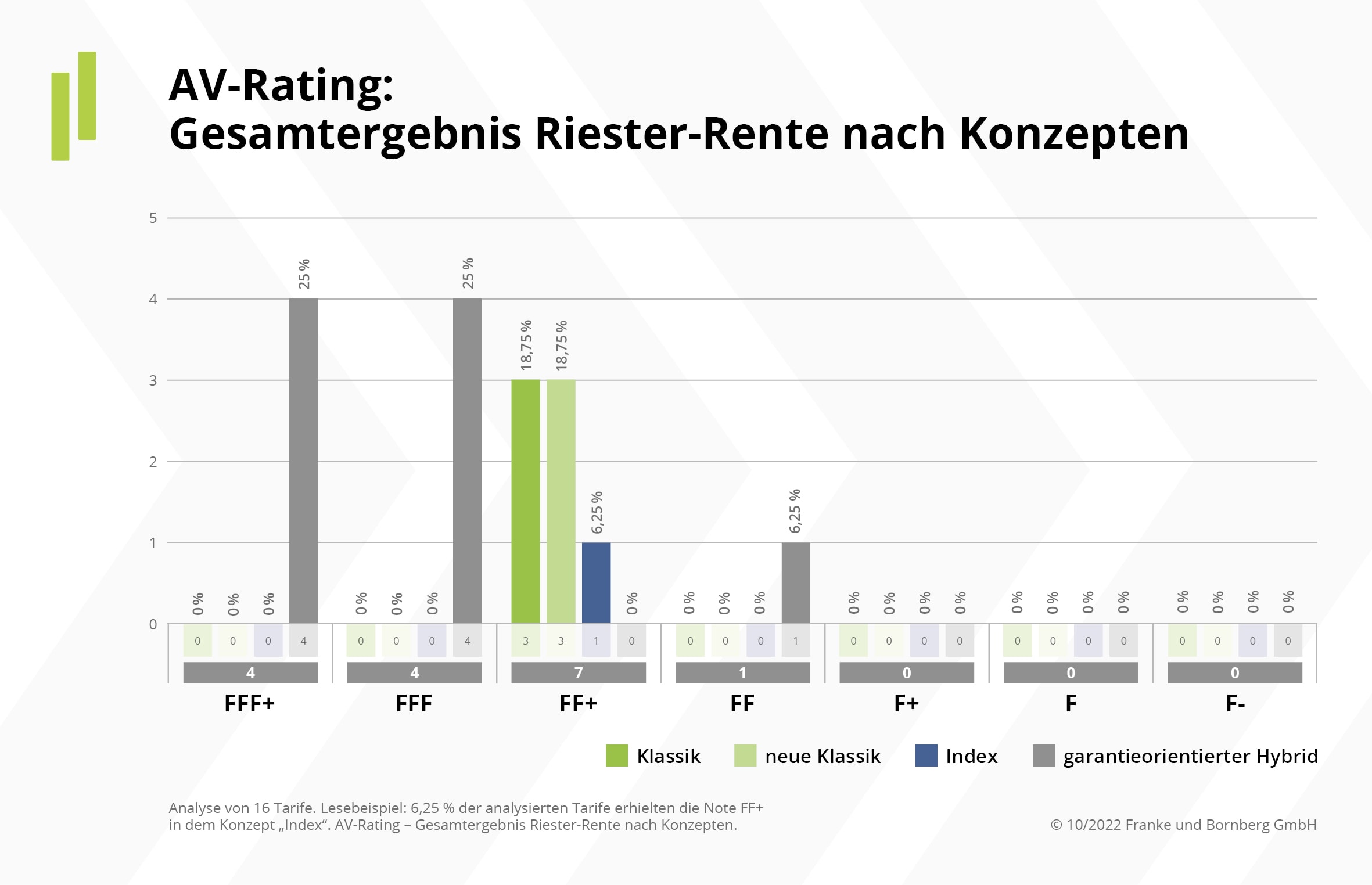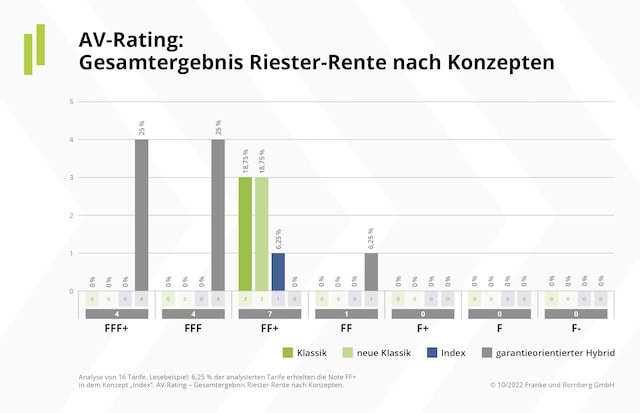 Um nicht Äpfel mit Birnen zu vergleichen, hat Franke und Bornberg Altersvorsorgeprodukte jetzt auch je nach Garantieniveau und Anlage des Sparanteils einer von fünf Kategorien zugeordnet. Für das Rating 2022 haben die Analysten Rentenversicherungen mit Indexpartizipation aus der Kategorie „Neue Klassik“ herausgelöst. Sie bilden jetzt eine eigene, sechste Rating-Kategorie. Damit soll die Vergleichbarkeit steigen.