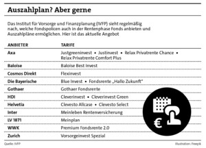Die Datenbank des Instituts für Vorsorge und Finanzplanung (IVFP) zählt derzeit 17 Tarife von 11 Versicherern, aus dem Kunden angeblich per Auszahlplan Geld entnehmen dürfen (siehe Tabelle). Trotzdem sollten Vermittler genau hinschauen. Denn zum Beispiel bei den vier Tarifen der Axa tauchen Auszahlpläne nicht in den Versicherungsbedingungen auf, Entnahmen sind problemlos möglich. Sollte sich der Kunde in der Rente für die sogenannte aktive Phase entscheiden, kommen keine freien Investmentfonds mehr infrage. Es sind lediglich Indexkomponenten möglich: nach unten abgesichert und nach oben gedeckelt.