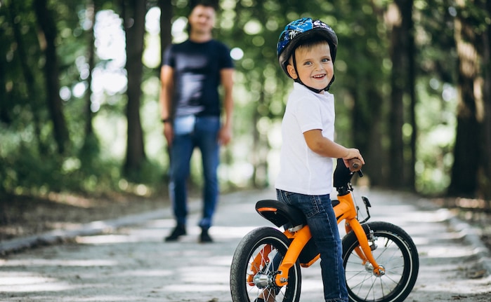 Ein Vater bringt seinem Sohn das Radfahren bei: Die Absicherung von Kindern in der Familienhaftpflicht ist nicht immer ganz einfach.