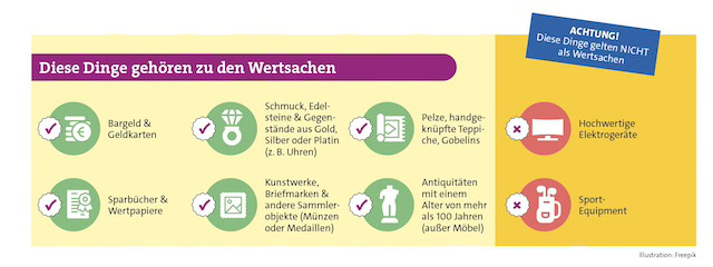 Die sind zwar ebenfalls in der Hausratversicherung enthalten, allerdings pauschal begrenzt. Normalerweise liegt diese Grenze zwischen 20 (bei alten Verträgen) und 40, manchmal gar 50 Prozent der Versicherungssumme. Hinzu kommen aber absolute Entschädigungsgrenzen, etwa für Bargeld von maximal 1.200 bis 1.500 Euro, für wertvolle Uhren, Schmuck oder Briefmarkensammlungen von 20.000 Euro.