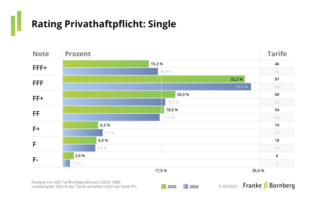 Aber wie sieht das Rating insgesamt aus? Ganz ordentlich, möchte man glatt sagen. Insgesamt betrachtete Franke und Bornberg 304 Tarife für Familien und 300 für Singles von 92 Haftpflichtversicherern.