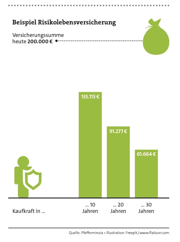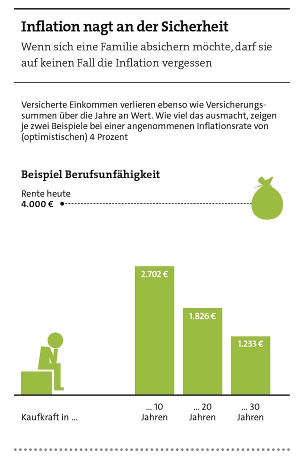 Allerdings kann das die Zeit erledigen, zumindest wenn man nicht aufpasst. Denn 6.000 Euro heute sind in zehn Jahren ganz sicher nicht mehr 6.000 Euro. Die – zurzeit schwer angesagte – Inflation wertet nominale Geldbeträge ab. Wie stark, das zeigen die Beispiele in den Grafiken auf dieser Seite. Deshalb sollte man die Beträge unbedingt über eine Dynamik nachziehen. Dann bleibt der Schutz auch über die Jahre erhalten.